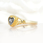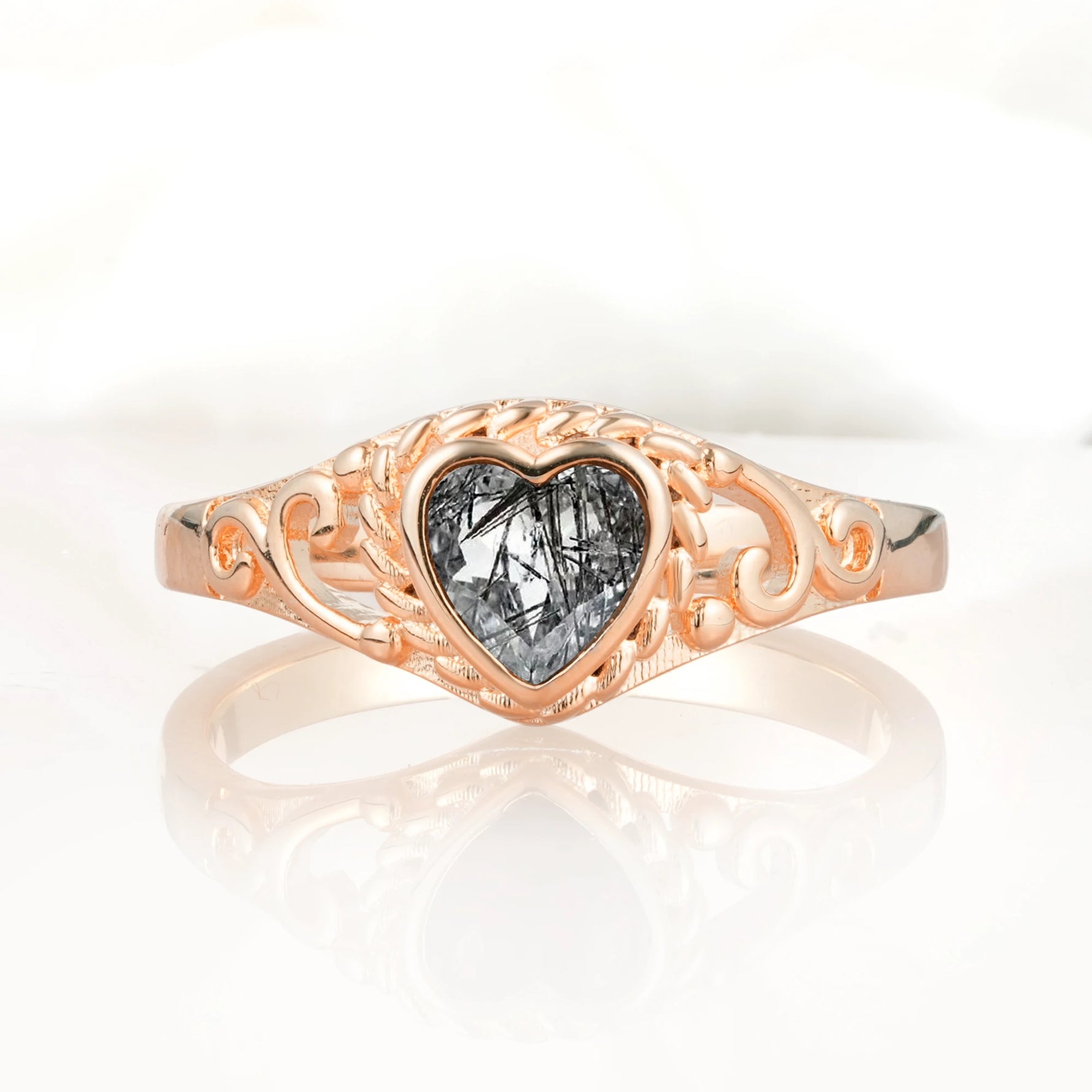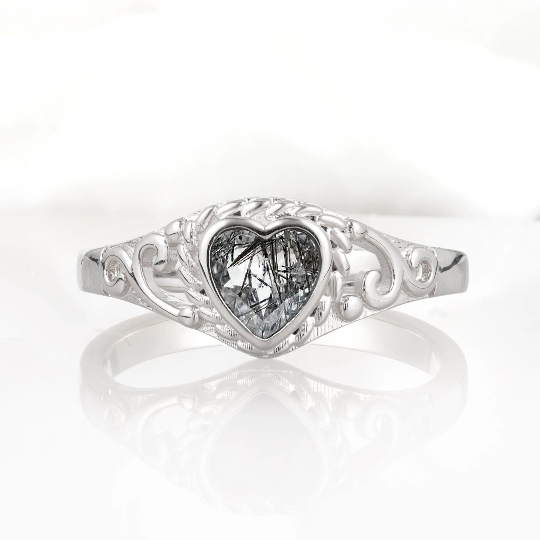 Heart-Shaped Black Rutilated Quartz Engagement Ring with Intricate Band