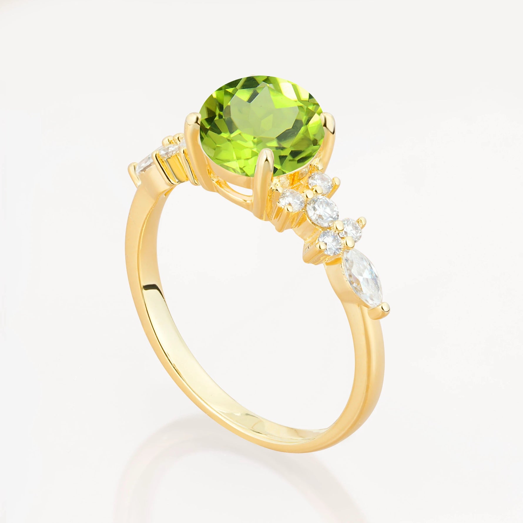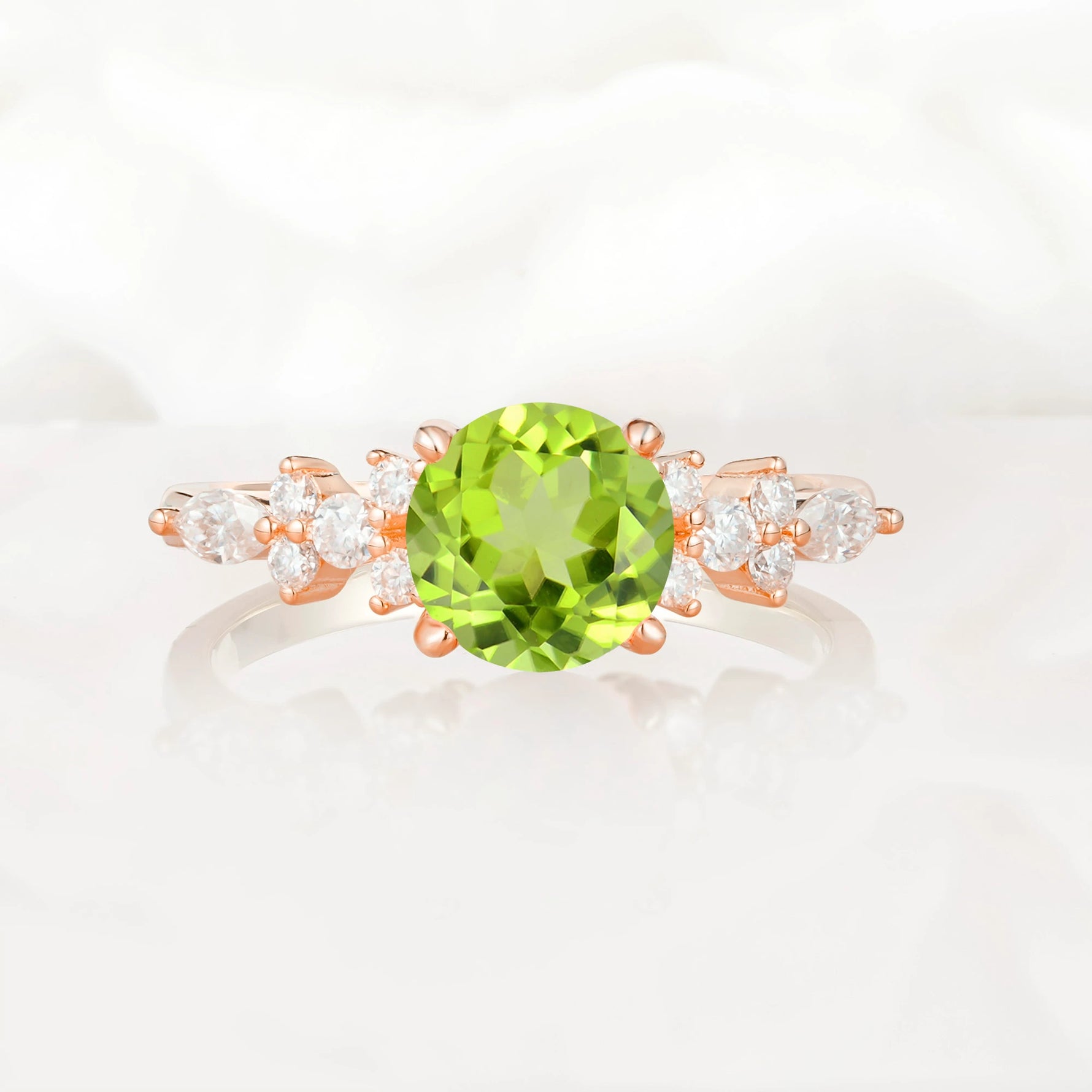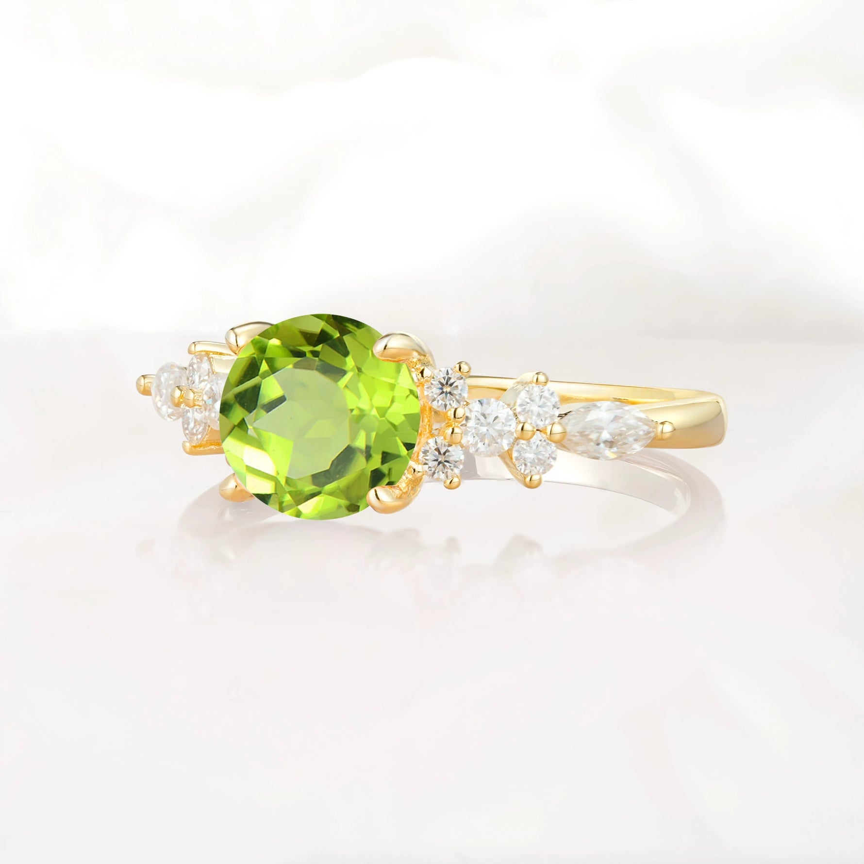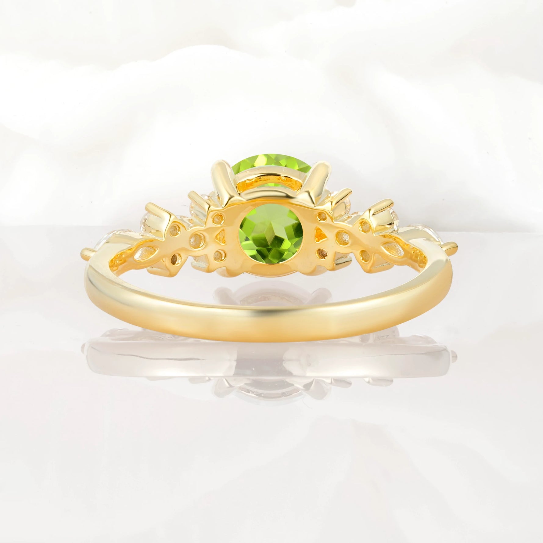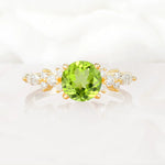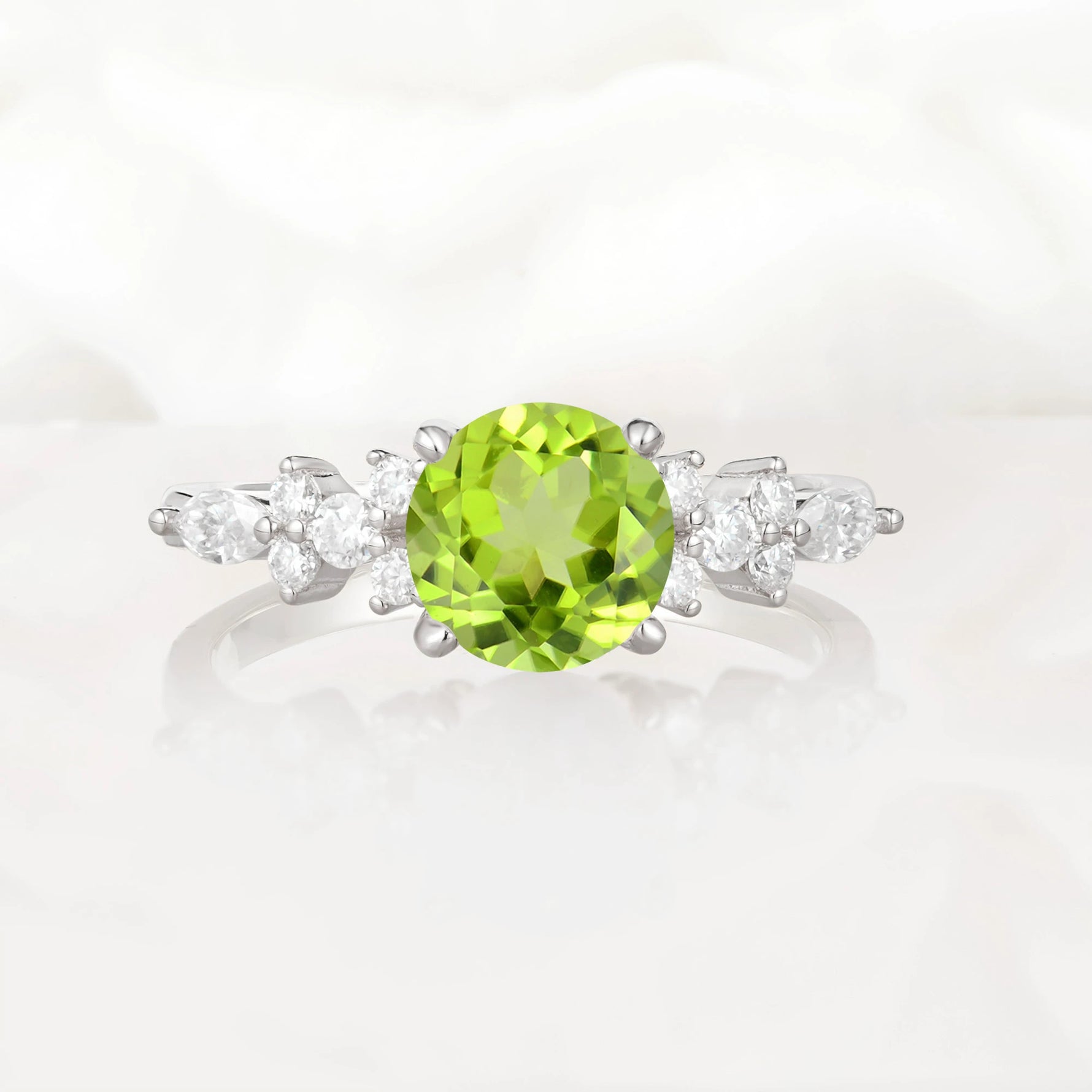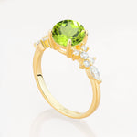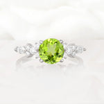 Round Cut Peridot Engagement Ring with Floral Side Stone Design