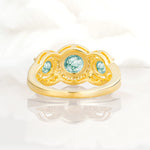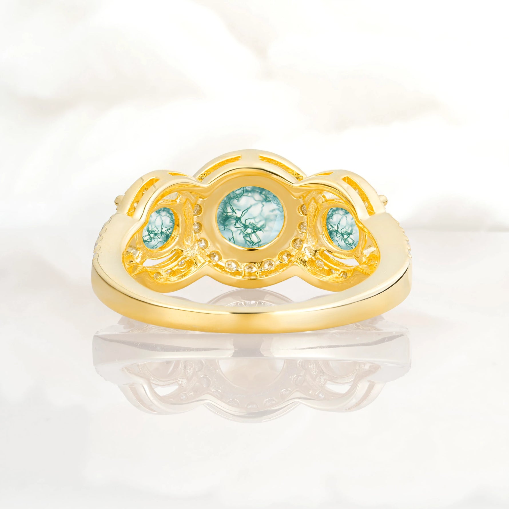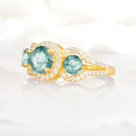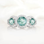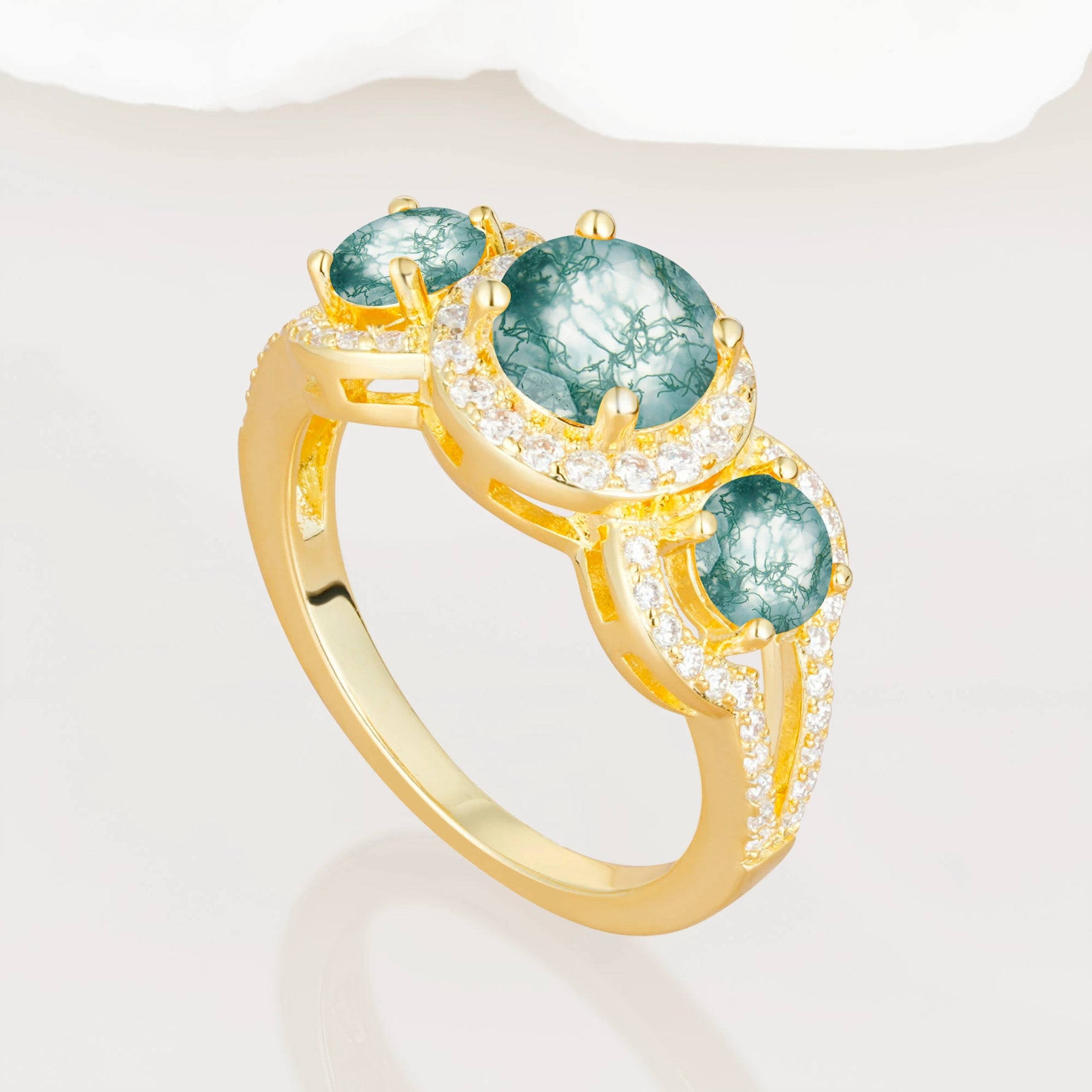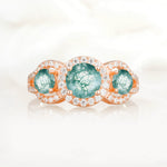 Three Stone Pavé Round Cut Moss Agate Engagement Ring